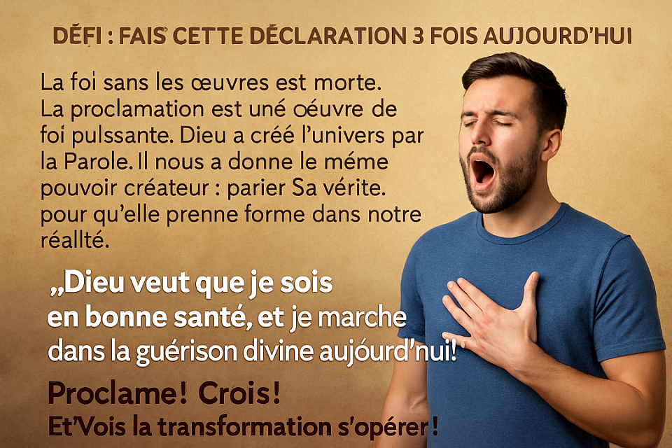 La foi sans les œuvres est morte. La proclamation est une œuvre de foi puissante. Dieu a créé l’univers par la Parole. Il nous a donné le même pouvoir créateur : parler Sa vérité pour qu’elle prenne forme dans notre réalité.